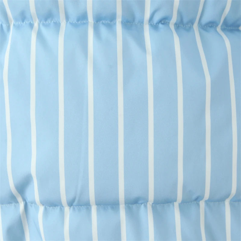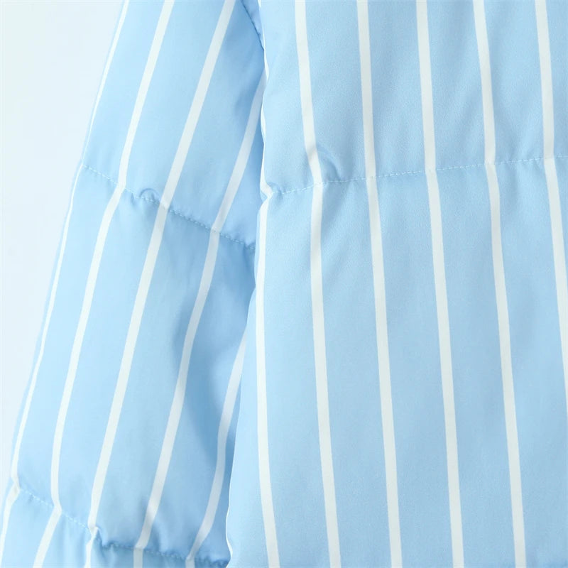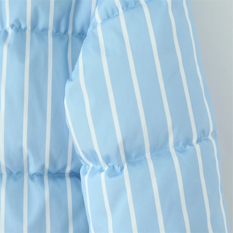 Tailored in a slim silhouette, detailed with clean vertical stripes, and wrapped in plush cotton warmth, it’s a jacket that turns cold-weather dressing into an everyday power move.