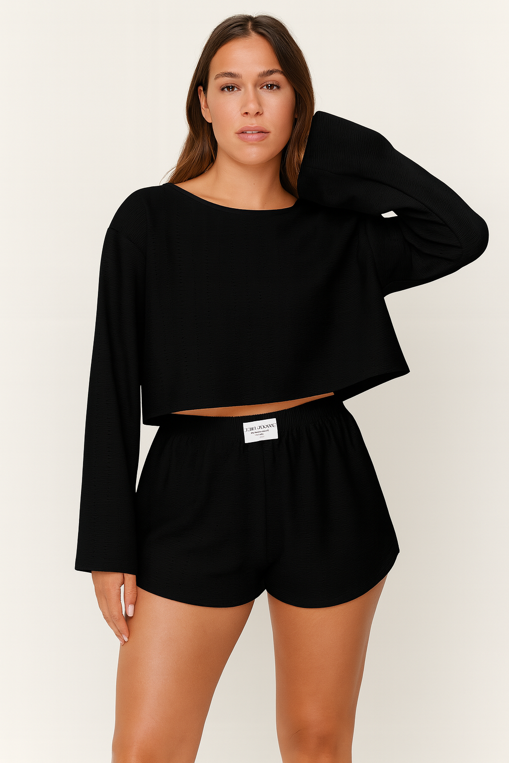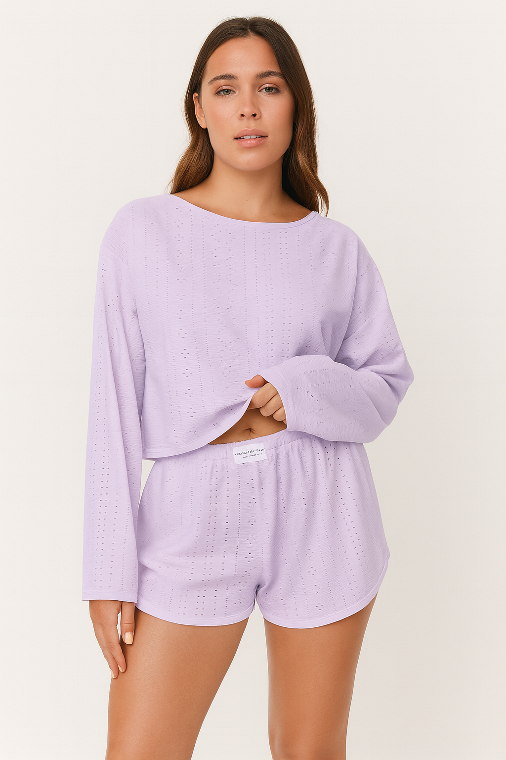 Slip into something cute, comfy, and just a little flirty! This Summer Pajama Set is made for warm nights, soft lounging, and feeling effortlessly adorable. With its hollow-out details, breezy long sleeves, and relaxed shorts, it gives you that cozy-but-stylish vibe whether you're curling up with a book or dancing your way to the kitchen for a midnight snack. Light, breathable, and irresistibly comfy—your new favorite homewear is calling!