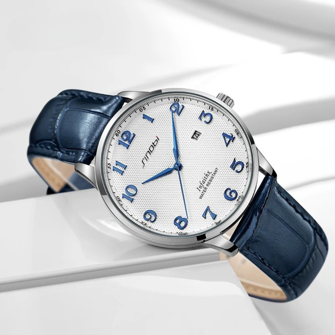 Met een comfortabele leren band (21 cm lang, 20–24 mm breed) en een stevige gespsluiting zit dit horloge perfect om je pols. Het wordt aangedreven door een betrouwbaar Japans quartz uurwerk en wordt geleverd met batterij. Het horloge is schokbestendig, waterbestendig tot 3 bar en beschikt over een volledige kalender.