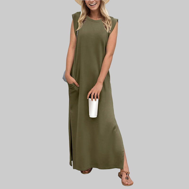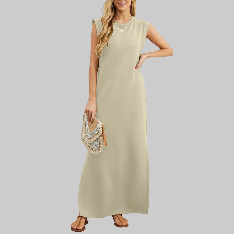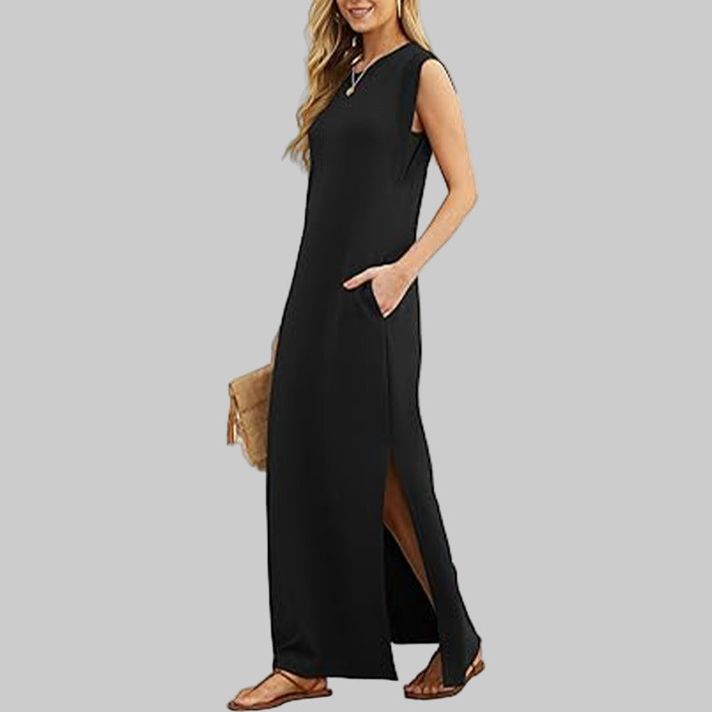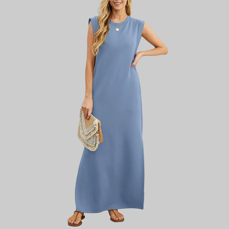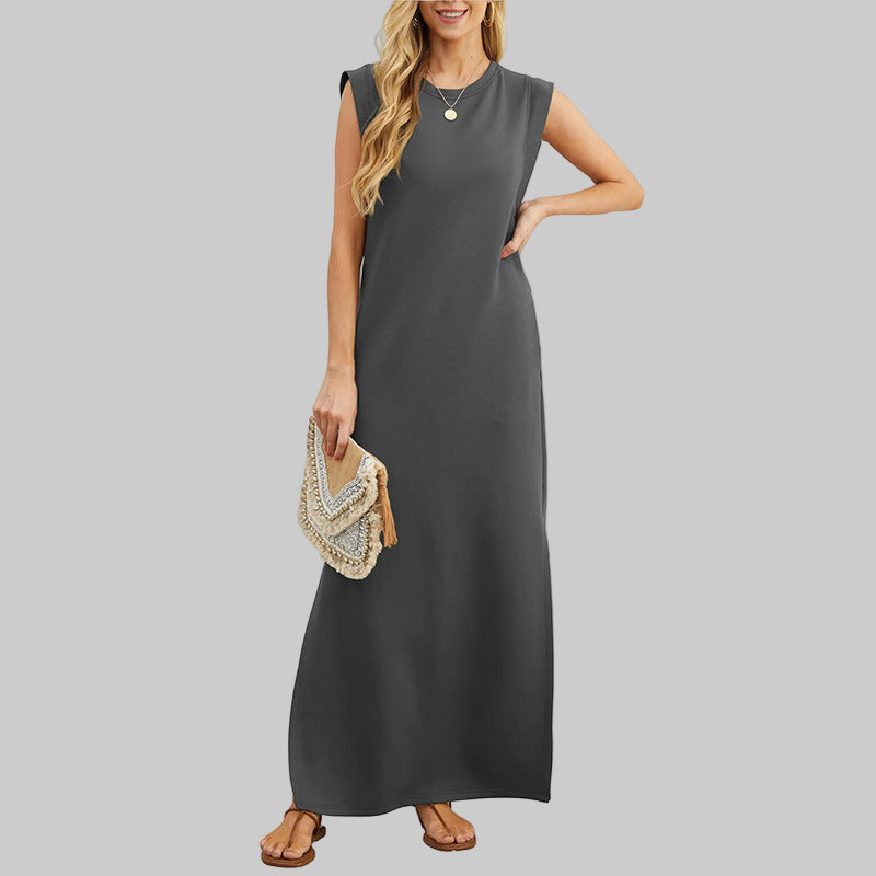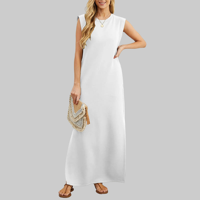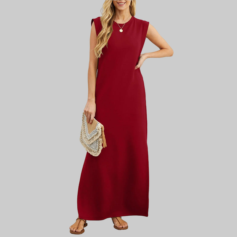 - Maxi-Elegantie: Ronde hals, mouwloos, enkel-lengte — stijlvol met sneakers of hakken.
