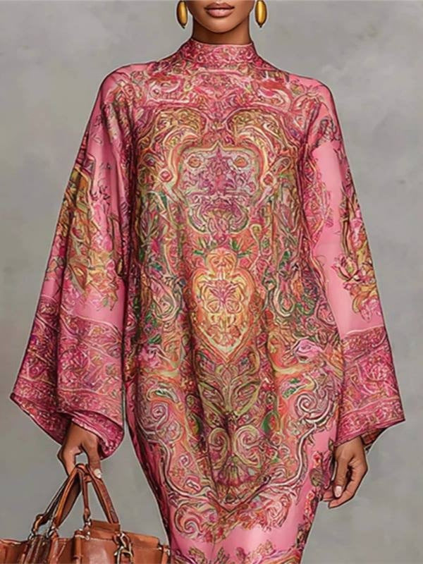 An artful expression of modern nostalgia, the Rosalie Imprimé™ dress captures the romance of vintage design through a contemporary European lens. Crafted from smooth, lightweight polyester with gentle stretch, this mid-length silhouette drapes effortlessly over the body in a relaxed, loose fit. A refined stand collar and softly structured long sleeves frame the form, while intricate digital printing layers rich color and pattern with painterly precision. Designed for autumn wear, it is a piece that feels expressive yet composed—elegant without effort, distinctive without excess .
